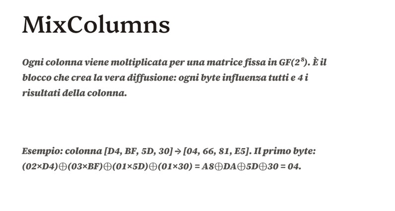 Ogni byte viene trasformato attraverso una tabella predefinita. Questo passaggio rompe qualsiasi relazione lineare tra input e output.