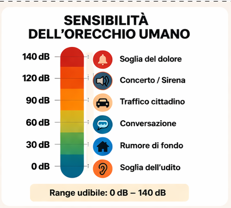 - 0 dB → soglia dell’udito
