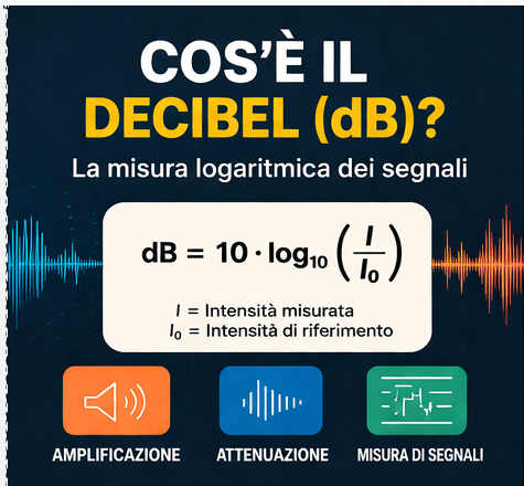 Il decibel (dB) è una unità di misura logaritmica utilizzata per esprimere il rapporto tra due grandezze, come ad esempio intensità, potenza o tensione di un segnale.