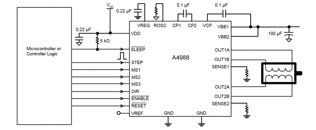 Vi voglio proporre il circuito integrato A4988, è un dispositivo che ha tutte le funzioni integrate per gestire appieno il motore,  l’implementazione software del suo driver è molto semplice, ed è  molto diffuso, soprattutto, nell’ambito makers, esistono in commercio già delle boards pronte all’uso ed in ultimo  è anche economico.