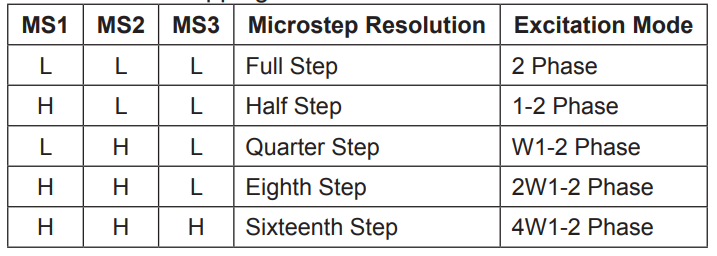Il circuito integrato A4988  integra un generatore PWM, il quale è gestito da una logica interna  configurabile tramite gli ingressi MS1, MS2  e MS3 (Vedi Figura 1). Nella Tabella 2,  è indicata la tabella di verità sulla risoluzione che il driver attua in funzione degli ingressi MSx.