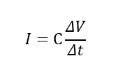dove I rappresenta la corrente elettrica che attraversa il condensatore, V è la tensione ai suoi morsetti, C è la capacità del condensatore e dV/dt rappresenta la derivata temporale della tensione.