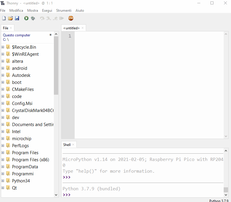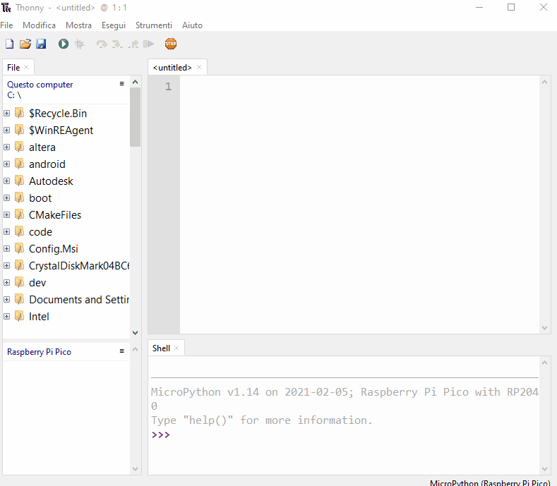 Sul mercato ci sono diverse IDEs per il sistema Pico, con alcune di esse e’ possibile gestire anche più di un linguaggio, in questo corso vorrei utilizzare il solo linguaggio MicroPython, e propongo di usare l’IDE Thonny, consigliato anche dagli sviluppatori della scheda Pico.