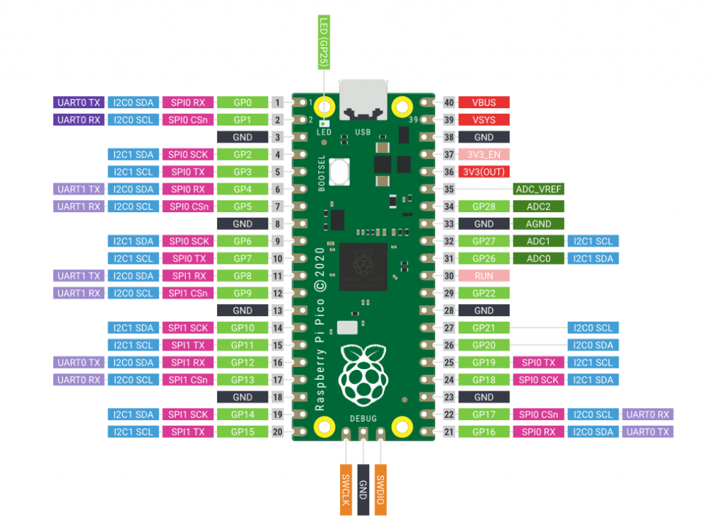Ma non dobbiamo escludere che il gruppo Raspberry che ha sempre costantemente migliorato le caratteristiche dei propri prodotti sia dal punto di vista delle prestazioni che delle funzionalità e non possa in un futuro prossimo, introdurre un nuovo microcontrollore con almeno una periferica wireless integrate. Nella Figura 1, è riportata la pin function della scheda Pico, scaricata dal sito di Raspberry.